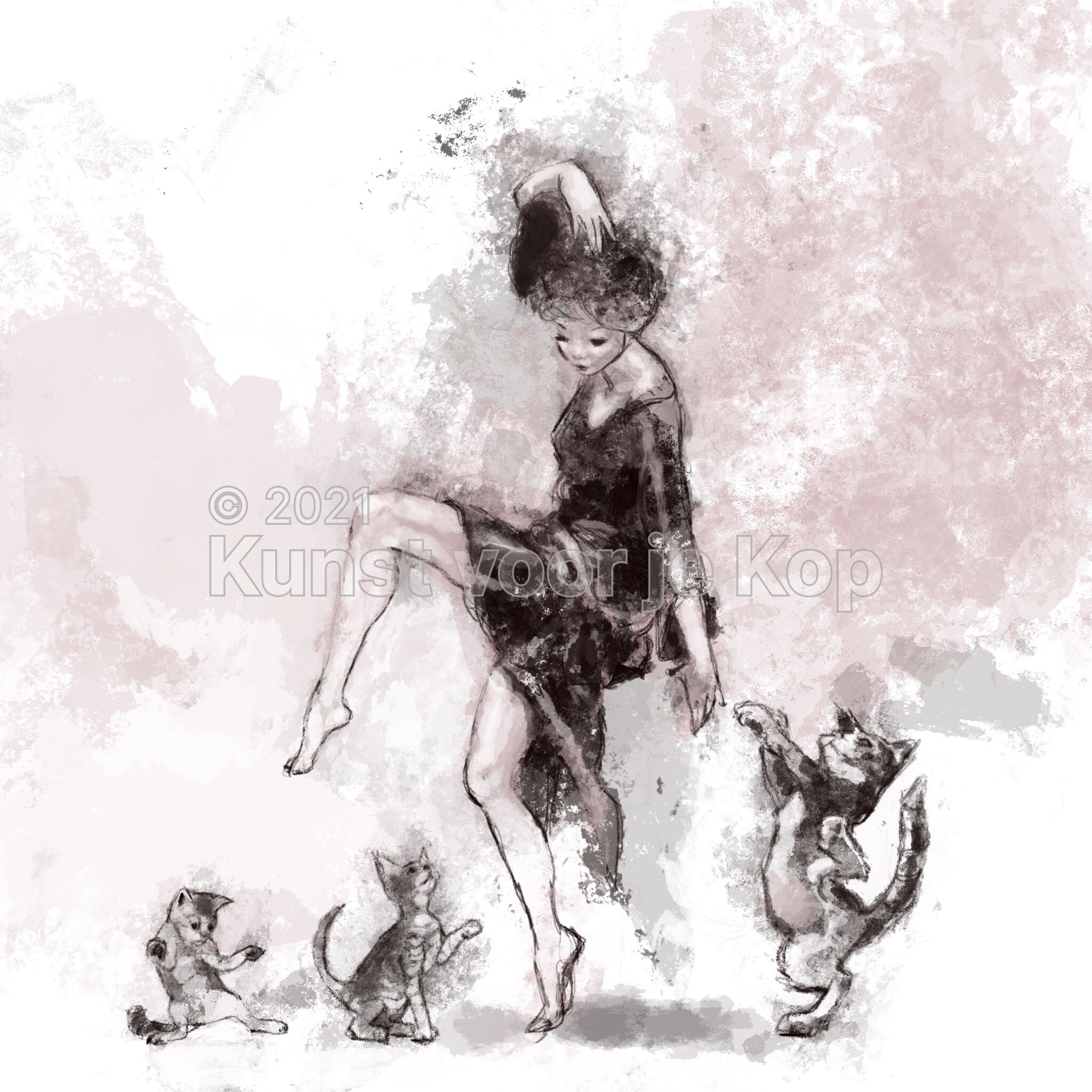 Een vrolijke serie tekeningen van dansende meisjes, met dieren die van de weeromstuit mee gaan huppelen.