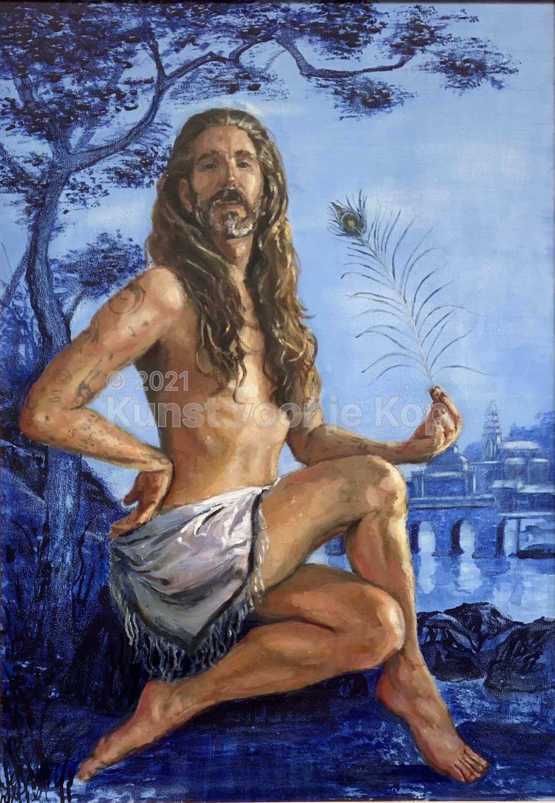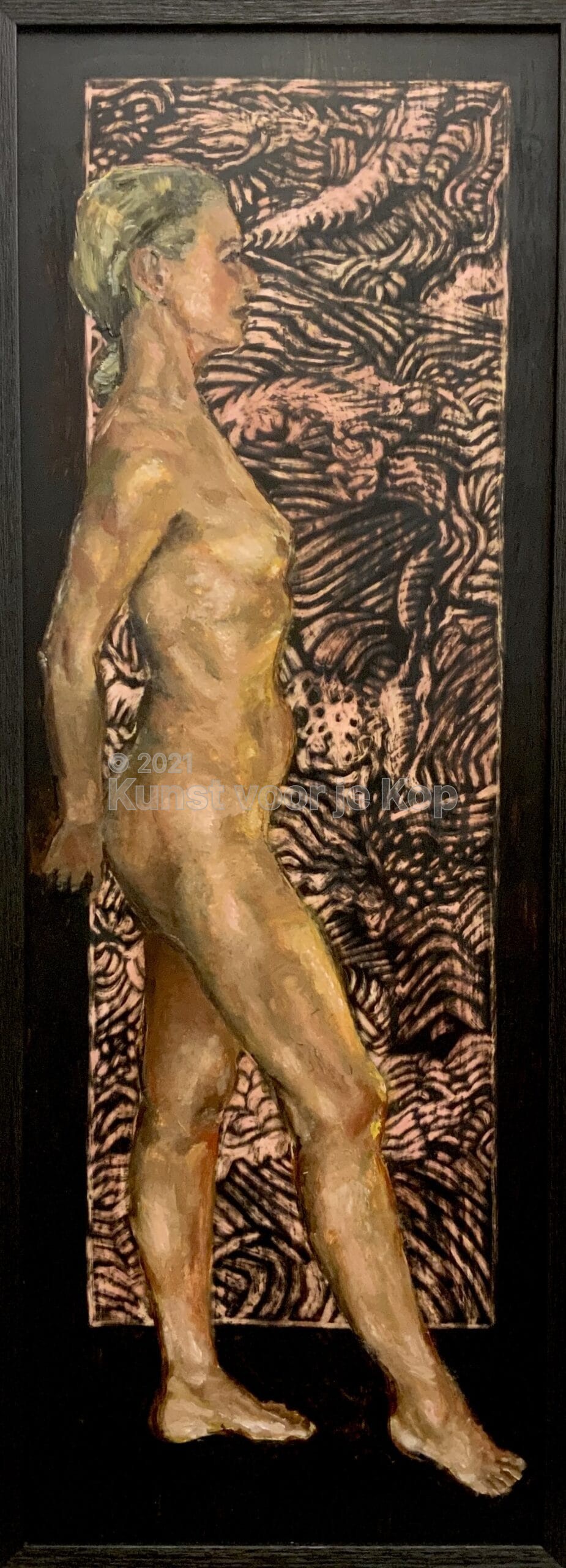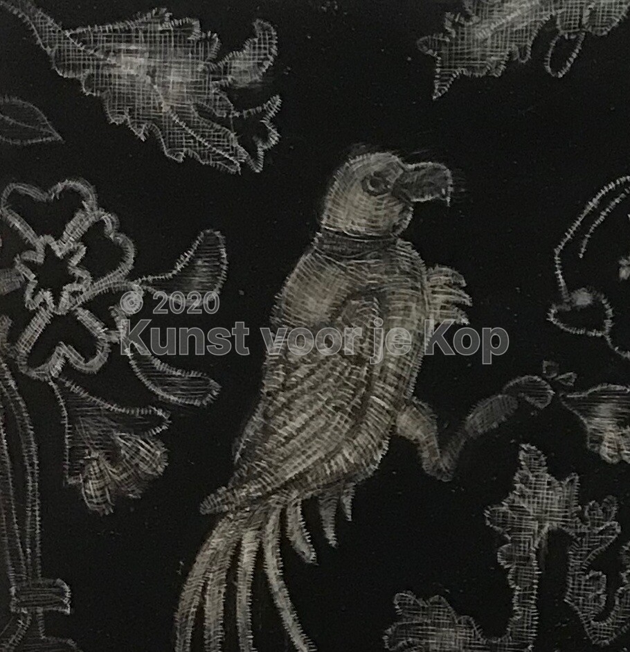 Het resultaat: een decoratief werk waar je met je neus bovenop wilt staan om de verfijnde inkttekening te bekijken. Maar om een samenhangend beeld te krijgen van de met een redelijk grove toets aangebrachte olieverf, doe je toch maar weer een paar stappen achteruit. En dan weer naar voren. Je blijft kijken.