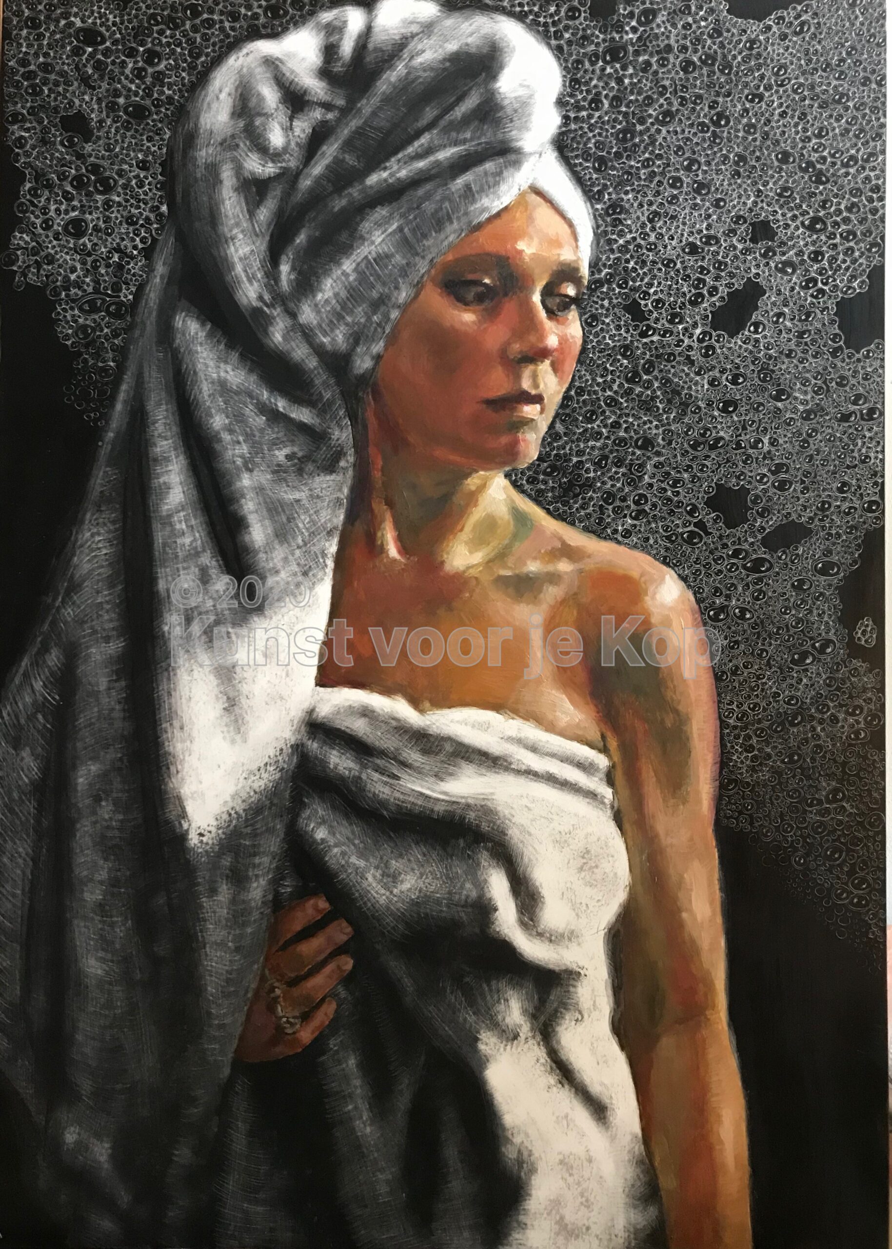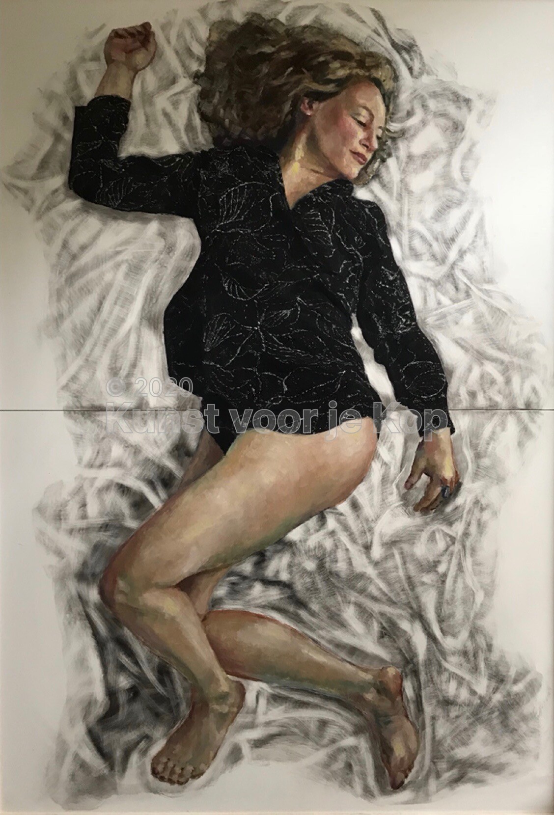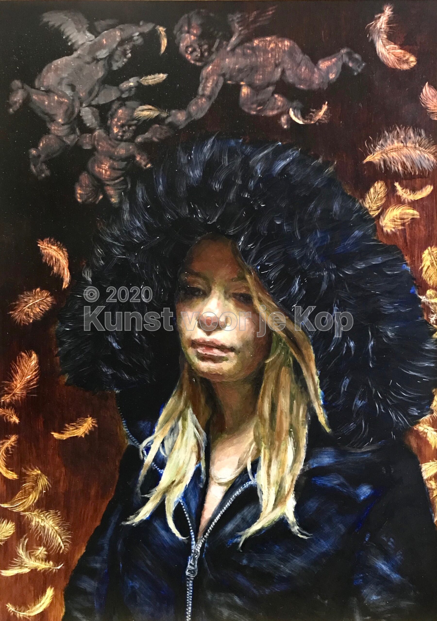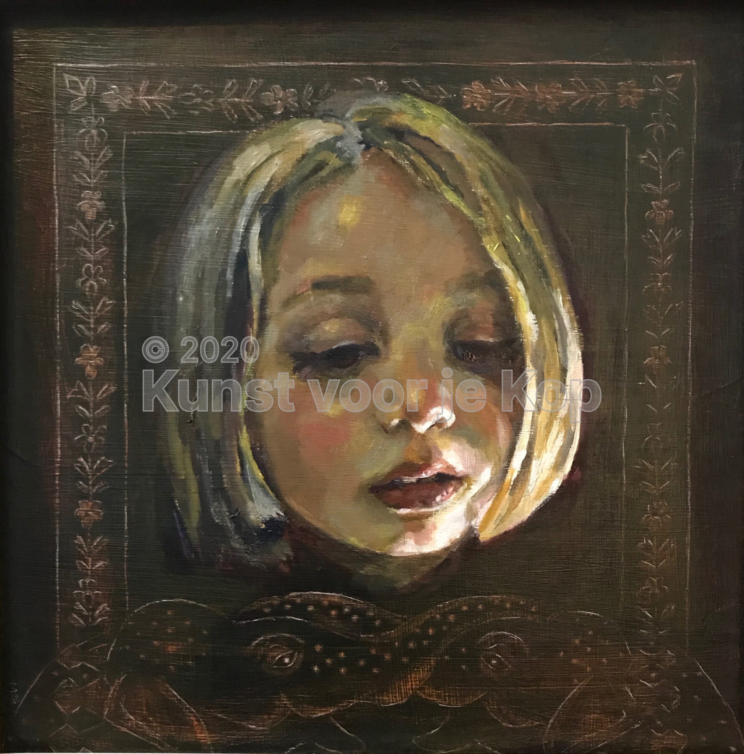 Goed, ik ben dus geïnspireerd door een mens, een dier, een beeld, een situatie. Hoe gaat het dan verder? Als ik heb bedacht hoe ik mijn model wil afbeelden, maak ik altijd eerst een ondertekening op een paneel bedekt met klei, ofwel een kleibord; voor de specifieke krastechniek die ik toepas, is een canvas niet geschikt. Vervolgens breng ik een laag inkt aan, waarin ik de afbeelding uitkras met verschillende tools, van etsnaalden tot schuurpapier, tot ik het juiste effect heb bereikt. Daarna is het tijd voor de volgende fase: de schildering in olieverf, die ik in meerdere lagen aanbreng. Ik begin met een grisaille, die bestaat uit grijstonen, om er alvast licht en donker in te krijgen. Dan volgt een laag met beperkt palet, en bij de derde en eventueel volgende lagen maak ik gebruik van een volledig palet en de glaceertechniek.